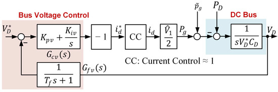 The MR regulator has infinite gains at selective frequencies, attenuating the harmonic components in , , and . Meanwhile, the fundamental component of is regulated by the unbalanced synchronous reference frame controller with an infinite gain at . Figure 6 depicts the equivalent bus voltage control loop. The low-pass filter time constant designed with the PI controller’s constants and is used for loop shaping. The grid current control loop is approximated as a unity gain because its bandwidth is far higher than the bus voltage control loop. The rejection of the harmonic components in the reference current allows the bandwidth of the bus voltage control loop to increase while maintaining the grid current near sinusoidal.