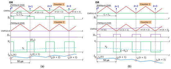 Timing diagram for interrupts, PWM generation, and analog signal samplings of the VSC: (a) for ; (b) for .