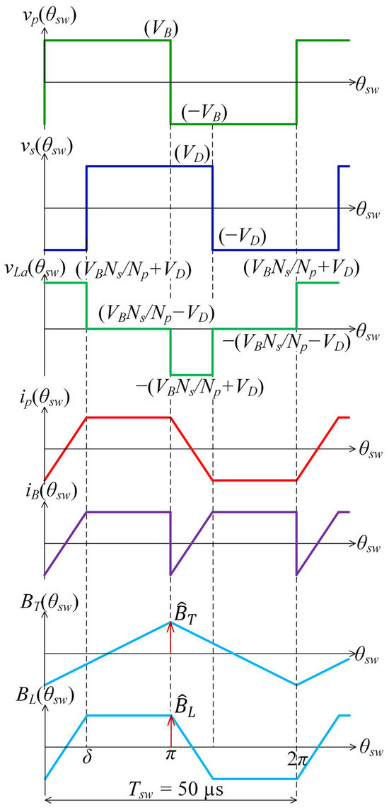 Flux density is an essential parameter for the design of the MF transformer and series inductor. According to the circuit topology in Figure 3, the transformer’s primary winding is directly connected to the LV bridge. So, the peak flux density of the transformer is proportional to the battery voltage, as given by