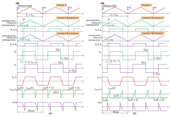 Figure 10 sketches the steady state timing diagram of the DAB DC-DC converter, implemented in the same ISR as the VSC control scheme in Figure 8. Counters 3–6 in the up-down mode generate the switching signals for the DAB DC-DC converter. The phase angles of counters 3–6 are synchronized with counter 1. Instead, the phase shift modulation is obtained by adjusting the CMPA3 to CMPA6 and the CMPB3 to CMPB6 registers of counters 3–6 [31]. During the rising period of counters 3–6, switches , , , and are turned on when the values of the counters equal their CMPAs registers. For the falling period, switches , , , and are turned off when the values of the counters equal their CMPBs registers. Thus, this modulation strategy accommodates the maximum phase shift angle of ±π/2. Note that switches , , , and complement switches , , , and respectively.