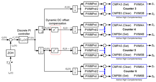 where MHz is the microcontroller’s clock frequency [26]. Thus, PWMprd = 2500 for a switching frequency of 20 kHz. This interrupt signal simultaneously triggers the selected analog-to-digital converters (ADCs) for voltage and current signal sampling at the time instant and the interrupt service routine (ISR) of the control algorithm for the VSC and DAB DC-DC converter. The resultant duty ratios are updated at the time instant . Each counter consists of two compare registers (CMPAx and CMPBx), independently controlling two PWM outputs (PWMxA and PWMxB). For the VSC control, only CMPAx registers generate the PWMxA outputs, while the PWMxB outputs are opposite to the relevant PWMxA outputs with a switching dead time (active high complementary with a dead time) [26]. Thus, the PWM1A and PWM1B outputs of counter 1 control switches and , and the PWM2A and PWM2B outputs of counter 2 for switches and . The synchronized operation between the ADC and PWM samples the average value of the grid current in each switching period both for the positive and negative regions of the modulation signal, as illustrated in Figure 8.