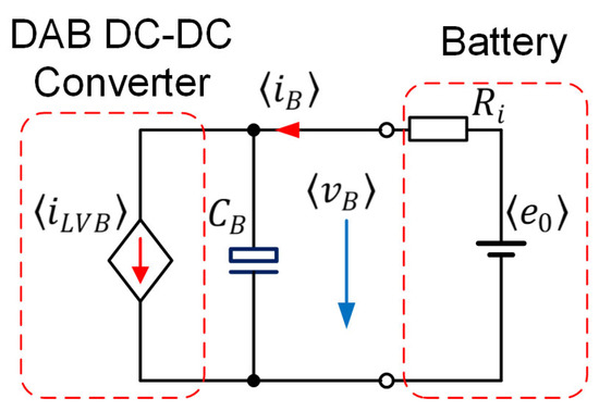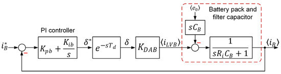 Figure 12 depicts the equivalent circuit on the battery side. The variables are averaged over a switching period of , denoted by the brackets ⟨ ⟩. Equation (23) yields the average current of the DAB DC-DC converter, while the battery is simplified with an open-circuit voltage and an internal resistance . The Thevenin-based equivalent circuit consisting of internal series resistance and capacitance paralleled with another resistance is more accurate than that in Figure 12 [32]. The Thevenin-based capacitance is much larger than the battery-side capacitance [33]. From the control point of view, thus, the open-circuit voltage in Figure 12 including the voltage drops in the Thevenin-based capacitance is the disturbance of the battery current control loop. Figure 13 depicts the equivalent block diagram of the battery current in the continuous time domain, where a PI regulator with the constants and controls the battery current. A delay of represents the sampling and transport delays, as illustrated in Figure 10. The gain is derived from the possible maximum value of (23), as given by