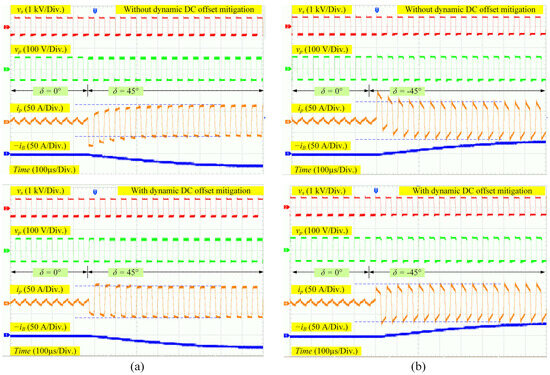 Open-loop transient response of the DAB DC-DC converter with and without the dynamic DC offset compensation scheme: (a) changing from 0 to π/4; (b) changing from 0 to −π/4.