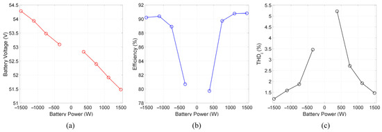(a) Battery voltage with battery power; (b) inverter’s efficiency with battery power; (c) total harmonic distortion of grid current with battery power.
