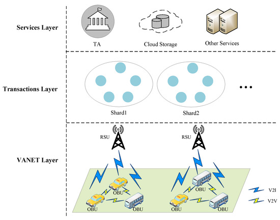 The VANET layer consists of roadside units (RSUs) and vehicles. Generally, data are generated through vehicle-to-vehicle (V2V) and vehicle-to-infrastructure (V2I) communication and uploaded to the blockchain for storage. After the computation and verification of a vehicle’s trust value, it is stored and managed by the shard where the vehicle is located, as well as the nearest RSU.