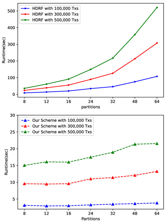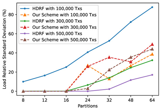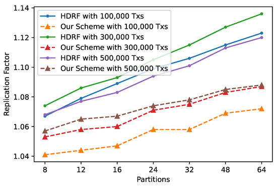 Observing Figure 5 and Figure 6, it is noticeable that an increase in the number of transactions led to a higher replication factor and standard deviation of the partition load. The enhanced vertex-cut algorithm, preserving community relationships between accounts, exhibited better performance with smaller partitions, while HDRF maintained a relatively stable replication factor across various partition sizes. In terms of the load standard deviation, HDRF’s preference for partitioning strategies that minimize the replication factor is evident. However, in scenarios with a high number of duplicate transactions, the penalty term failed to effectively balance the partition load and replication factor. On the other hand, the approach proposed in this paper, involving the secondary partitioning of communities, achieved a more effective balance across multiple partitions.