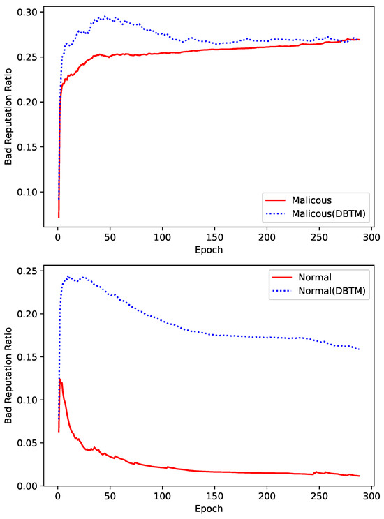 Subsequently, we compared the variation trends of negative reputations for normal and malicious vehicles in the trust-management model based on the DST theory proposed by us and the DBTM trust-management model under the same parameters, as shown in Figure 8.