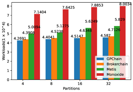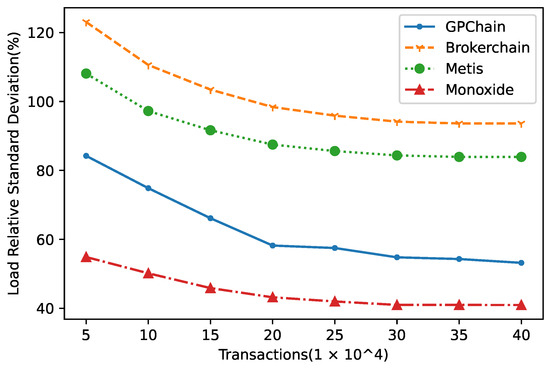 Figure 10, Figure 11 and Figure 12 present the differences in the workload and the relative standard deviation of the workload under different numbers of shards and data scales for different solutions. Table 1 contains more detailed information. It can be observed that GPChain demonstrated superior workload performance across various data scales and shards, with the relative standard deviation of the workload maintained at a lower level. This indicates that our proposed solution can accommodate a larger transaction volume compared to other solutions under similar hardware conditions. Monoxide, as a representative of a sharding blockchain without any optimization, exhibited the highest workload, but also the lowest relative standard deviation of the workload. Brokerchain, as an improved solution on Metis, demonstrated similar performance across various parameters, outperforming the Metis solution to a certain extent, indicating that edge-cut algorithms can significantly optimize the workload, albeit at the expense of increasing the disparity in the workload between shards.