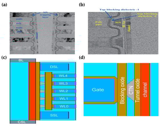 (a,b) TEM image of the cross-section of 3D NAND with a confined nitride trapping layer. Reprinted/adapted with permission from Ref. [], 2019, VLSI. (c) Schematic cross-section of 3D NAND with a confined nitride trapping layer used in the simulation. (d) Detailed zoom-in view of (c).