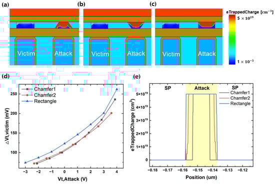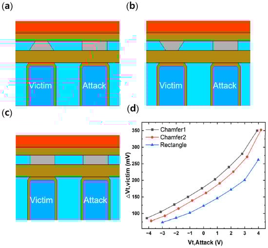 Therefore, simulations were conducted by altering only the confined trap layer structure of the victim cell, as illustrated in Figure 5a–c. Figure 5d presents the results of Z-interference experiments for these three structures. When only the confined trap layer structure of the victim cell is modified, Z-interference appears larger in the following order: chamfer 1, chamfer 2, and rectangle. This result contrasts with the Z-interference result when only the confined trap layer structure of the attack cell was changed. Consequently, as depicted in Figure 2e, it matches well with the Z-interference result when all confined trap layers of the entire string are altered.