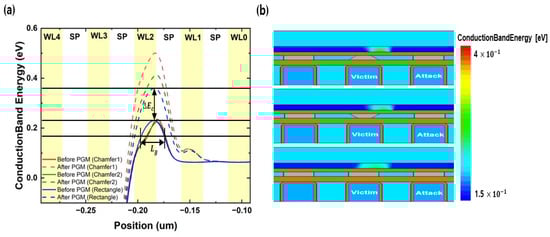 Conduction band profiles of chamfer 1, chamfer 2, and rectangle with the structure of the victim cell altered. In this situation, victim WL bias is at Vt, and the other WLs are at the read voltage. (a) Comparison of the conduction band energy before and after programming the attack cell. (b) Conduction band profiles of chamfer 1, chamfer 2, and rectangle before programming the attack cell.