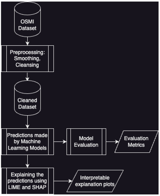 The methodology for the experiments is further described in Figure 1. After preprocessing the data, various machine learning models are used to make predictions and are evaluated using a number of metrics. The models are then passed as parameters to LIME and SHAP explainers to generate interpretable plots.