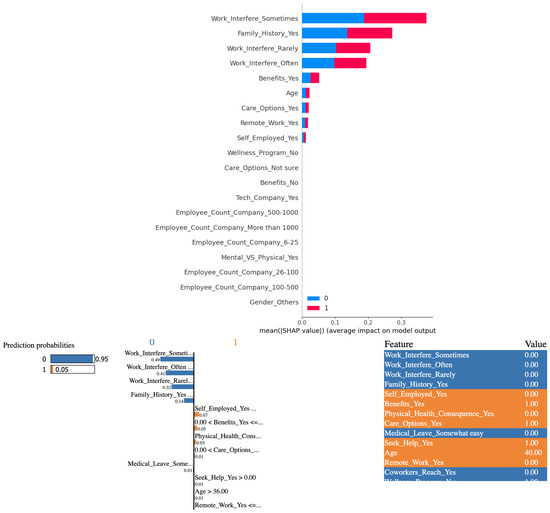 In Figure 3a, at the top, there are three charts. The leftmost is the predicted outcome. In this specific instance, the outcome is “no mental health issue with 90% certainty”, indicated by the blue-colored bar. The rightmost chart is a listing of the feature–value pairs for the specific instance. Each feature in the middle plot is represented by a color-coded bar whose length (positive or negative) indicates its overall contribution to the prediction. Higher positive values imply the feature pushes the prediction toward the outcome of the corresponding color, while higher negative values imply it opposes it. For instance, the biggest factor that pushed the prediction to a “no” is in blue, called “Work_Interfere_Sometimes”, which corresponds to the survey question “If you have a mental health condition, do you feel that it interferes with your work?” Interestingly, it played a more significant role in the model predicting “no” than Work_Interfere_Rarely, which is a fallacy. One would expect that if the mental health condition interferes less frequently or, for that matter, does not interfere less frequently, meaning never interferes, it would be a better predictor of the complete absence of mental health condition than if it interferes more frequently or does not interfere more frequently. The latter case implies that there is still a possibility that it still interferes once in a while, hence the fallacy.