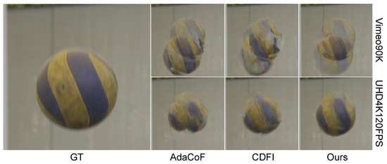 Visual comparison of our method with 2 state-of-the-art (SOTA) methods on UHD4K120FPS testing dataset. The 2 SOTA methods are AdaCoF [7] and CDFI [8]. The training datasets are Vimeo90K [9] dataset with a resolution of 448 × 256 and UHD4K120FPS with a resolution of 3840 × 2160. GT: Ground Truth.