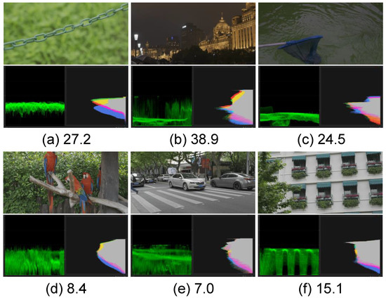 Some examples of the UHD4K120FPS dataset and their oscilloscope display. In each example figure, above is the original image, below left is the brightness waveform graph displayed by the oscilloscope, and below right is the colour space histogram. The numbers indicate the magnitude of the optical flow between input frames in 30 fps.
