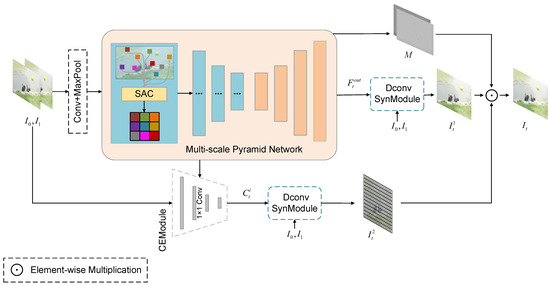 Firstly, and are preprocessed, and then multi-scale feature map , occlusion map M, and contextual feature maps are obtained by MPNet and CEModule, respectively. DConv SynModule is applied to and to generate warped frames and , respectively. , , and M are combined using tensor operations to synthesise . M is used to blend the two warped frames and . is defined as:
