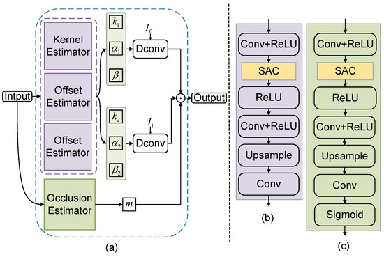 The structural diagrams of DConv SynModule: (a) DConv SynModule; (b) kernel estimator and offset estimators; (c) occlusion estimator.