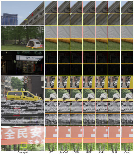 We compare the proposed method with other SOTA VFI methods, including AdaCoF [7], Compressed AdaCoF [8], CDFI [8], RIFE [12], XVFI [5], and FILM [29]. These models are trained using the same strategy on the and evaluated on the with different sizes and temporal distances, as well as on two benchmark datasets, UCF101 [20] and Middlebury [21]. The quantitative experimental results in Table 1 demonstrate that our model achieves the best performance on and also shows excellent performance on other testing datasets. Specifically, when trained on , our model outperforms XVFI [5] by 0.12 dB and FILM [29] by 0.10 dB on (1/4). These results provide evidence of the superior performance of our model in handling 4K videos. Furthermore, the results in the table confirm the impact of different frame rates and resolutions of the datasets on the performance of VFI models. This method of cross-validation by different training and test sets side-by-side reflects the importance of the dataset for VFI tasks with different scenarios. In addition, we find that our model outperforms FILM [29] by 0.35 dB and 0.71 dB on UCF101 [20], when trained on with TD = 1 and TD = 2, respectively.
