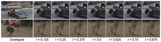 We created an Ultra-high-definition (UHD) video dataset, named UHD4K120FPS, which comprises 300 high-dynamic-range video scenes captured in real-world environments using a SONY Alpha 1 digital camera (manufactured by Sony Corporation, Tokyo, Japan). Each scene has a spatial resolution of 3840 × 2160 and a frame rate of 120 fps, with durations ranging from 5 to 20 s. To ensure the selection of valuable data samples, we manually excluded blurry video scenes and selected 245 video clips, each with 5 consecutive frames, featuring various objects and scenes. We used GMFlowNet [23] to estimate bidirectional optical flows between the first and last frames in each video clips, and clips with small motion magnitude were eliminated by setting a threshold of 9 for the optical flow magnitudes of each clip. Ultimately, we selected 120 scenes with optical flow magnitudes ranging from 9.96 to 63.52 pixels, with an average of 17.97 pixels. Among these, 108 scenes were used as the training dataset, and 12 different scenes served as the testing dataset, denoted as , with each scene serving as a separate test sample. The average optical flow magnitudes of the test samples were 23.05 pixels, indicating the presence of large motion. The training dataset is denoted as . To create a training sample, we randomly cropped a series of 128 × 128 patches at the same location in 5 consecutive frames.