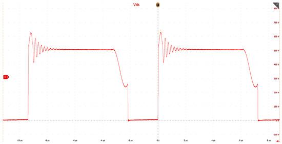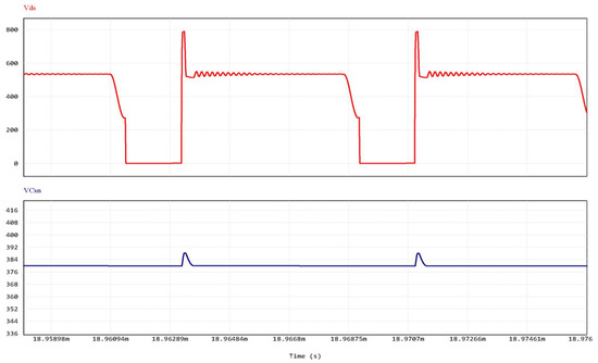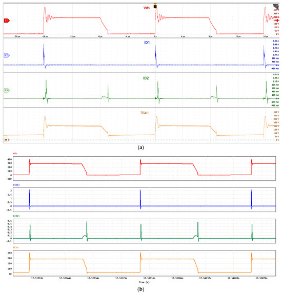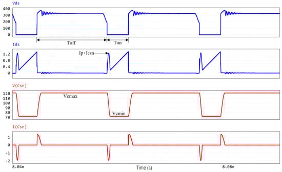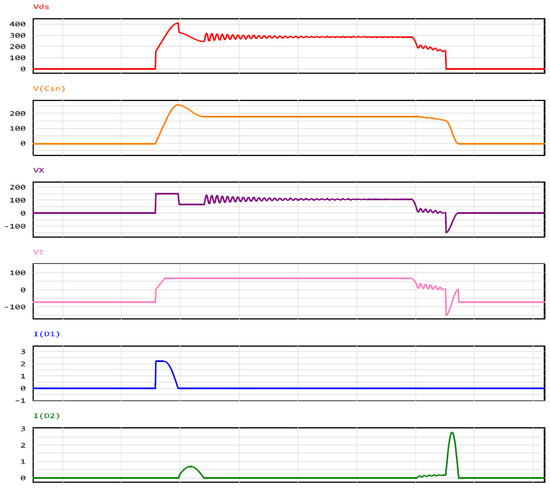 The waveforms reported in Figure 5 were obtained by simulating the converter with a constant input voltage (Vg = 400 Vdc). As shown in the figure, before the turn-off, the voltage across the snubber capacitance, Vcsn, is equal to Vcmin. At turn-off, the diode D1 is forward-biased due to the leakage energy, and the voltage at the anode of D1, i.e., Vx, will be almost equal to the input voltage Vg. At the same instant, due to the bootstrap effect of the snubber capacitance, the voltage at the drain node, Vds, must be equal to Vg + Vcmin.