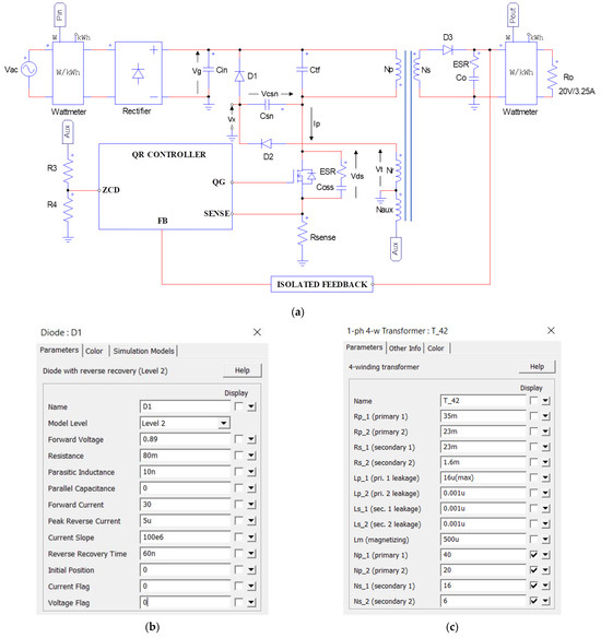 PSIM Model and main quantities of the considered Quasi-Resonant GaN-based Flyback Converter with Regenerative Snubber (a) Circuit model (b) Quantities of the snubber diodes (c) Quantities of the transformer.
