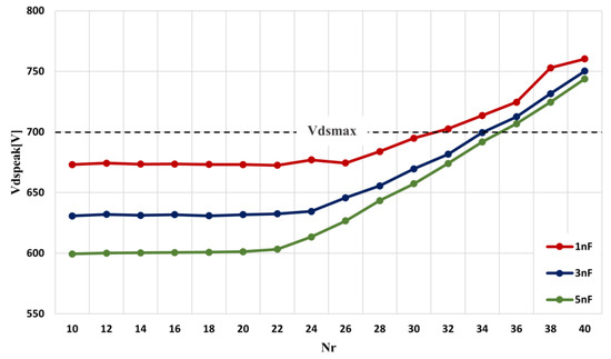 As explained in the previous section and as shown in Figure 8, the snubber effect decreases when Nr is greater than 20. Moreover, the parametric evaluation with Nr ≥ 30 is pointless, because the peak on the drain voltage exceeds the maximum acceptable value (700 V) in the worst case (Csn = Csnmin).