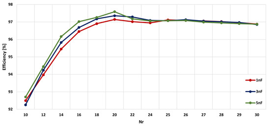 In the simulations, Nr was varied from 10 to 40 and, the snubber capacitance Csn was varied from 1 nF and 10 nF, according to Equation (12), the other quantities are set to the values reported in Figure 4b,c and Table 1 and Table 2. In such a case, being discrete and limited the search space due to component admissible values, as mentioned before, it was not necessary to adopt any optimization technique, which is usually used when one needs an optimal design with a limited number of evaluations of the objective function.