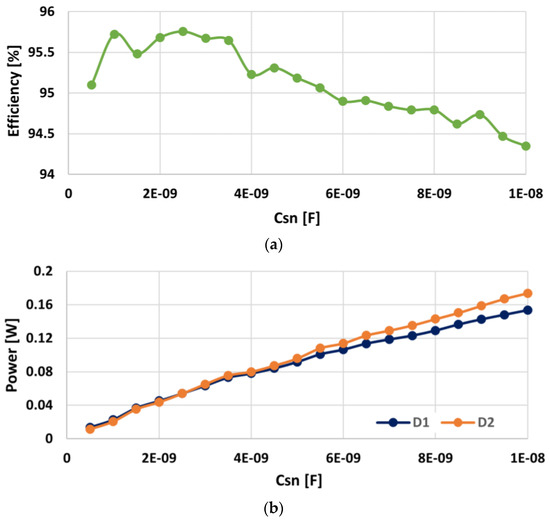 Moreover, the one just reported represents the most interesting result since in the case of high input voltage and low input voltage at maximum load conditions, an increase in snubber capacitance led to a very slight increase in efficiency. Considering both cases, it can be deduced that the optimal snubber capacitance is the minimum value (1 nF).