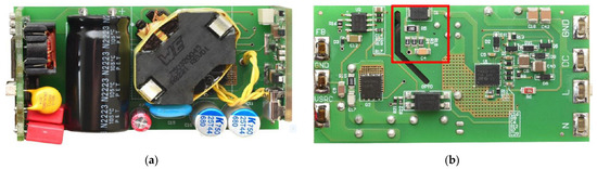 Application board: (a) top view; (b) bottom view. A magnification of the red box is reported in Figure 12.