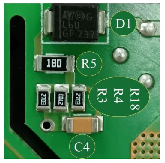 Figure 11 represents the top and the bottom sides of the application board. In the bottom side of the board, it is possible to identify the RCD snubber characterized by the diode D1, the capacitance C4 and the resistances R3, R4, R5, and R18, which is better shown in Figure 12.