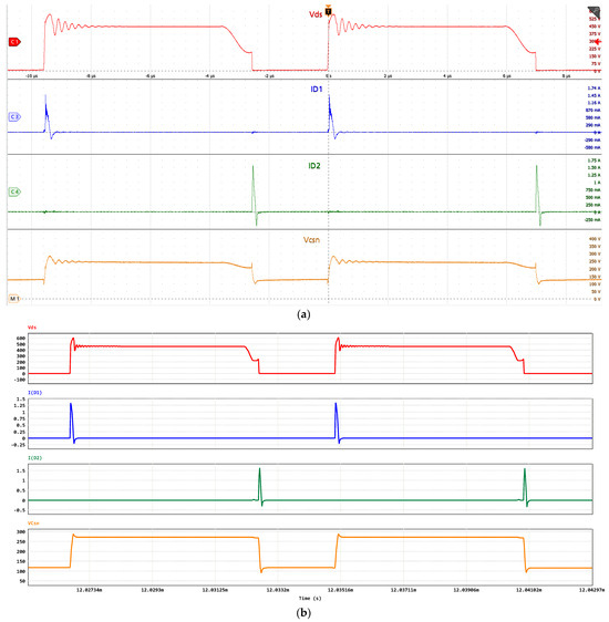 The main waveforms were analyzed by supplying the application board at the nominal input voltages of 115 Vac and 230 Vac, to verify that the regenerative snubber perform as predicted in simulation. Figure 14 and Figure 15 show the main experimental and simulated waveforms at 230 Vac and 115 Vac, respectively.