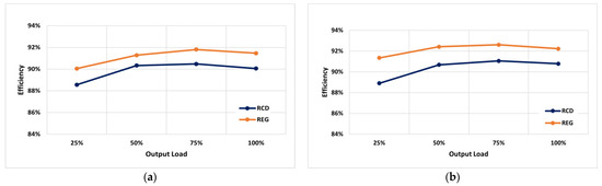 The efficiency measurements have been performed by replacing the energy regenerative snubber with an RCD snubber maintaining the same snubber capacitance value to have the same snubber effect. The efficiency curves at different operative conditions are compared and reported in Figure 17 and Figure 18. The plots show that the efficiency in the case of regenerative solution is higher in both cases (low and high input voltage) regardless of the dc output profiles.