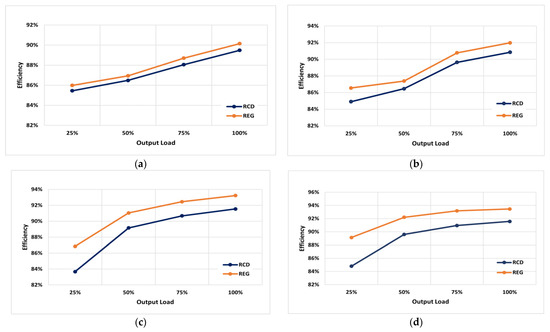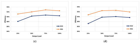 Efficiency Curves comparison for 115 Vac input voltage and output voltage equal to (a) 5 V, (b) 9 V, (c) 15 V, (d) 20 V.