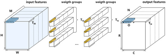 In the design of CNN hardware accelerators, the computation mapping strategy [25,26,27] plays a crucial role in achieving improved performance, energy efficiency, and real-time capabilities. Carefully designed computation mapping schemes enhance hardware utilization by efficiently utilizing computational capabilities during CNN task execution. This not only reduces the time required for inference but also provides stronger computational support for applications in resource-constrained environments. As illustrated in Figure 1, the parallelization factor for feature input channels is denoted as , and for feature output channels as . The input feature data are divided into channel groups, and the output data into input channel groups. The output channels correspond to the weights, meaning that the weights are also divided into weight groups. The number of channels in the last group may be less than or , and any insufficient parts are filled with zero values to ensure data regularity and calculation accuracy. Within each input channel group, O sets of -length data are sequentially input into the multiplication array, where O represents the maximum computation block width. Each layer consists of (R × C)/O computation blocks. When the plane convolution calculation for O output feature points is completed, the computation for this channel group concludes, and the computation for the next input channel group begins, until all input channel groups have been calculated.