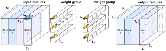 Usually, the bandwidth and on-chip cache pressure can be reduced by using chunked computation. The scheduling of the middle layer of the network adopts the format, so when the size of the value is determined, the output feature width slicing factor is then fixed, and the size of the chunked computation output feature map is , and the corresponding size of the input features should be , as shown in Figure 11.
