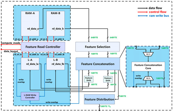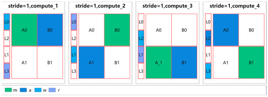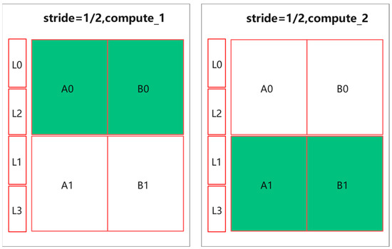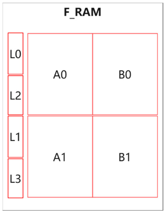 Therefore, the basic structure of the on-chip feature cache array is a small random-access memory (RAM) used to cache historical feature data, and two feature group RAMs used to cache input features of size . Let L represent the small RAM, and A and B represent the RAMs storing the feature group data. The constructed feature cache array is shown in Figure 8. In this array, L(0–3) stores the overlapping part of the feature blocks in the C direction, and A(0–1) and B(0–1) represent different partitions of the corresponding feature group RAMs. According to the previous analysis of the usage of one-dimensional convolutional feature data, when the stride is 1, alternating between A0 and B0 is sufficient to meet the input feature requirements, while when the stride is 2, one block operation consumes two blocks of feature group data. Therefore, in order to ensure an uninterrupted supply of feature data, the presence of A1 and B1 is required to form a double buffer.