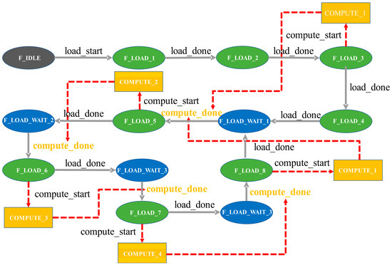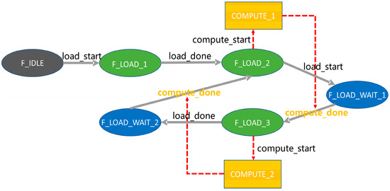 The control logic for loading features and starting computation in RMC format is shown in Figure 13. In the figure, load_start controls the initiation of the feature loading request, and load_done indicates the completion of feature loading when there are no available feature spaces for loading. compute_start controls the start of a new computation block, and when the feature cache-ready data satisfy the space combination described above, the feature distribution for the new computation block begins. compute_done indicates the completion of the current computation block, allowing for the release of feature spaces and the efficient utilization of on-chip cache and data bandwidth.