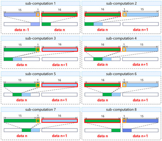 When dealing with RMC format feature distribution, when if 17 input features points are obtained, the calculation for the case and can be completed. As shown in Figure 15, where data n − 1, data n and data n + 1 denote the input features of BW bytes of adjacent addresses and the selected feature data are indicated by bold-colored boxes.