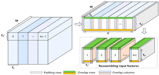 For RMC format features, the number of input feature rows to be loaded by row is determined according to to handle padding rows and overlap rows correctly. The feature distribution is performed by selectively splicing the loaded input feature data and dividing the output feature width direction into tcc sub-computations according to . denotes the number of output feature width direction chunks according to , ), as shown in Figure 14.