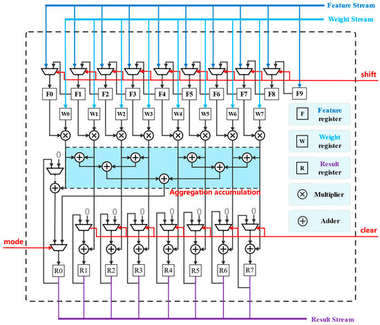 To address the issue of utilization efficiency in large graph and small channel computation arrays under conventional multi-channel parallel hardware acceleration strategies, we propose the use of configurable vector units (CVU) as the core units for hardware acceleration. The key feature of these units is the adjustable working mode for accumulation operations, which supports both aggregate accumulation and element-wise accumulation modes. The detailed design of the CVU is shown in Figure 24, where the mode signal controls the selection of accumulation mode, the shift signal controls the shifting of feature data, and the clear signal resets the accumulation result.