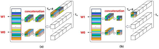 When conducting 2D convolution with , the multiplication operations corresponding to output feature points are decomposed onto the multiplication units, as depicted in Figure 3a. Conversely, when the input channels are sufficiently large and no 2D convolution is performed, the multiplication operations in the input channel direction are mapped onto the multiplication units, as illustrated in Figure 3b.