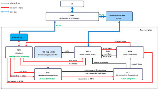 The DMA module handles data transfer requests between the accelerator and external memory interfaces. The Scheduler decomposes the computation of the entire network layer into block computation requests in the row and column directions, and controls the DMA to load input features. The DRC module guides the distribution of feature data, weight data, and instruction data to the ACC module.