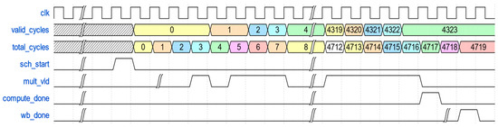 We can evaluate the efficiency of the computational array by tracking the effective number of working cycles of the multiply-accumulate array in the computing layer. The effective number of working cycles of the tracking multiplication and accumulational array in the computing layer starts from the start signal of the first block calculation and continues until the end signal of the last block calculation has been written back. We can calculate the efficiency of a multiply accumulate array by dividing its effective working cycles by the total number of cycles in the computing layer. The timing chart for computing unit performance statistics is shown in Figure 28, where total_cycles are recorded from sch_start signal to wb_done.