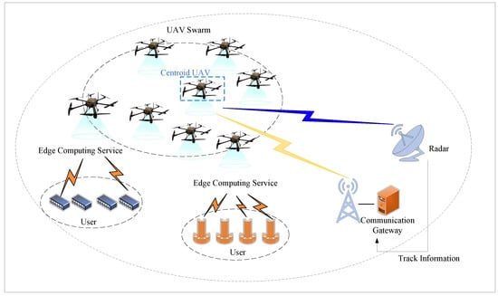 The proposed method in this paper aims to improve the accuracy of UAV swarm centroid tracking by utilizing a three-dimensional coordinate-coupled dynamic model and multi-model filtering assisted by a GRU network. The improved tracking results can be used for ground communication by airborne nodes in UAV swarm-based edge computing. Therefore, this section provides the key background information to familiarize readers with the working model of the system and the main principles involved.