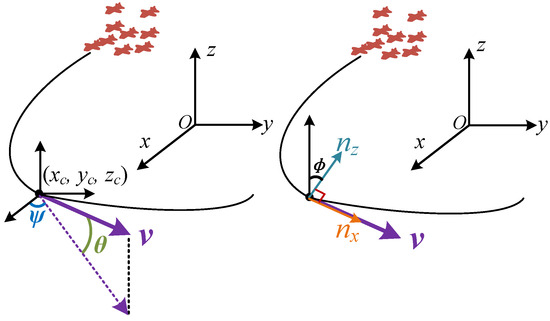 As depicted in Figure 2, the reference origin in the Cartesian system is set as the observer, and the position of the UAV swarm can be expressed as . The velocity of the center point relative to the origin of the coordinate system can be expressed as a scalar . The pitch angle is defined as the angle between the velocity direction and the XOY plane, while the yaw angle is the angle between the projection of the velocity direction onto the XOY plane and the X axis. It should be noted that “pitch” and “yaw” in this paper describe the trajectory characteristics and should not be confused with the vehicle attitude angles described in [19]: