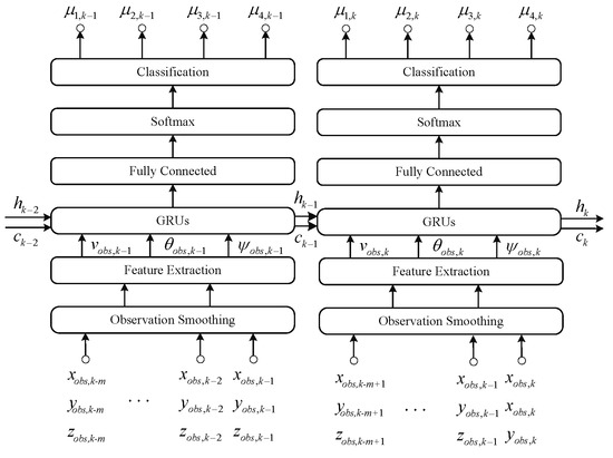 The gated Rrecurrent unit (GRU)-based approach is another variant of recurrent neural networks (RNNs) that is widely used for learning features from sequence data [44]. In this paper, the GRU network is employed to estimate the model probability and replace the calculation of the model transition probability in multi-model filtering. Similar to LSTM, a GRU also utilizes gates to adaptively control the flow of information.