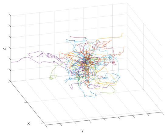 The validation trajectory’s length was 1213 s, with the observation update frequency set to 0.5 s. The , and values were set as 15 m, , and , respectively. We divided the validated trajectory into 30 segments, with a randomly generated maneuver mode used in each segment. The target’s velocity relative to the coordinate system’s origin fell within the range of (50, 120). The pitch variation for a single time segment was within the range , while the yaw variation’s range was . We obtained the initial state values for filtering from Equation (23). The track generation process was similar to that in Section 4. Refer to Figure 5 for the tracking scenario. The simulation tool used in this paper is MATLAB 2021A.
