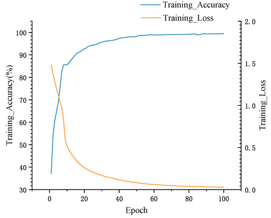Figure 6 illustrates the training process of the model estimation network. After a predetermined number of 100 iterations, the classification accuracy reached 99.5413%, and the loss function decreased to 0.02419. The network convergence performance was also better, as expected.