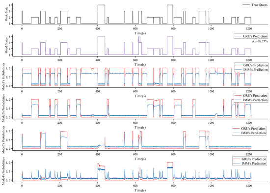 True mode and estimated mode probabilities of the maneuvering centroid. The topmost subgraph represents the true mode. The subgraphs below compare IMM estimates and GRU estimates for each model.