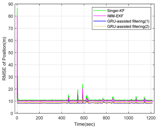 A 1000 run Monte Carlo simulation of position estimates is shown in Figure 8, which compares the root mean square error (RMSE) values of different algorithms. The IMM-EKF that employed the dynamical model proposed in this paper achieved more accurate state estimation than the Singer model. Overall, GRU-assisted filtering yielded a more accurate state estimation compared with the traditional IMM method. In Figure 9, we show the tracking results of the centroid, comparing the Singer-EKF, IMM-EKF, GRU-assisted filtering (1), and GRU-assisted filtering (2). GRU-assisted filtering (1) and GRU-assisted filtering (2) represent the model weight being zero or one and the model weight being the output of the softmax layer, respectively.